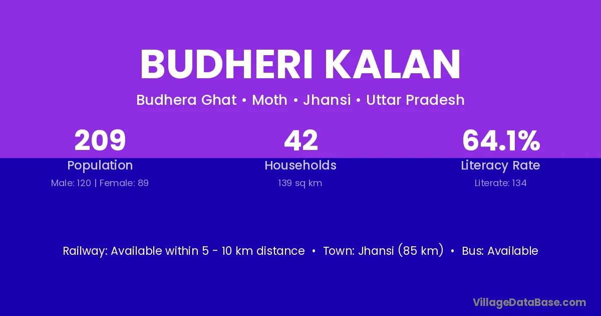 Jhansi (85 km) is the nearest town to Budheri Kalan village for major economic activities and is located approximately 85 km away.