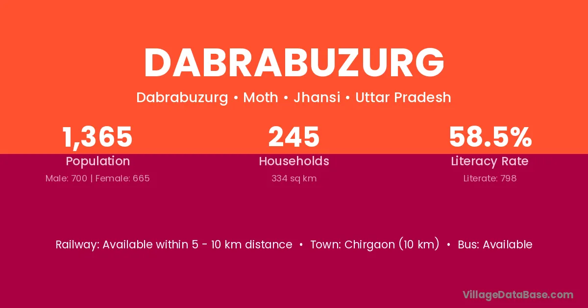 Chirgaon (10 km) is the nearest town to Dabrabuzurg village for major economic activities and is located approximately 10 km away.