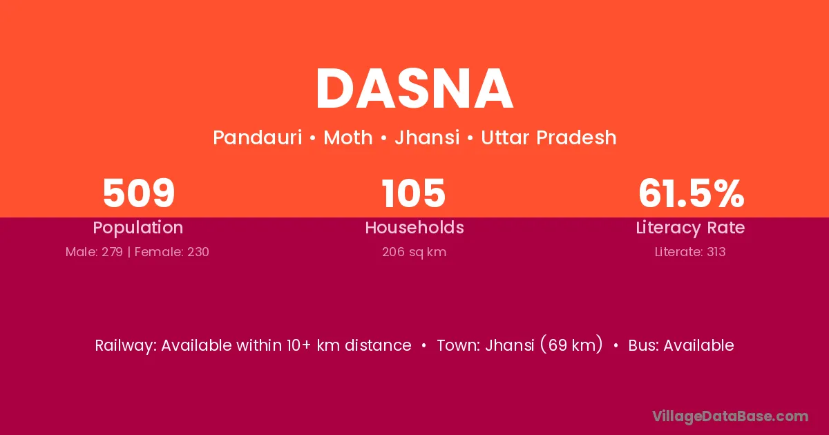 Jhansi (69 km) is the nearest town to Dasna village for major economic activities and is located approximately 69 km away.