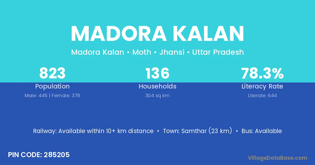 Samthar (23 km) is the nearest town to Madora Kalan village for major economic activities and is located approximately 23 km away.