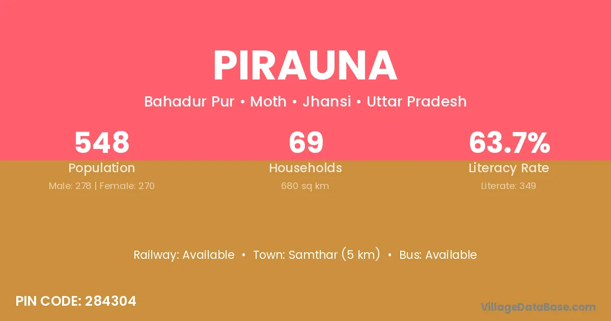 Samthar (5 km) is the nearest town to Pirauna village for major economic activities and is located approximately 5 km away.