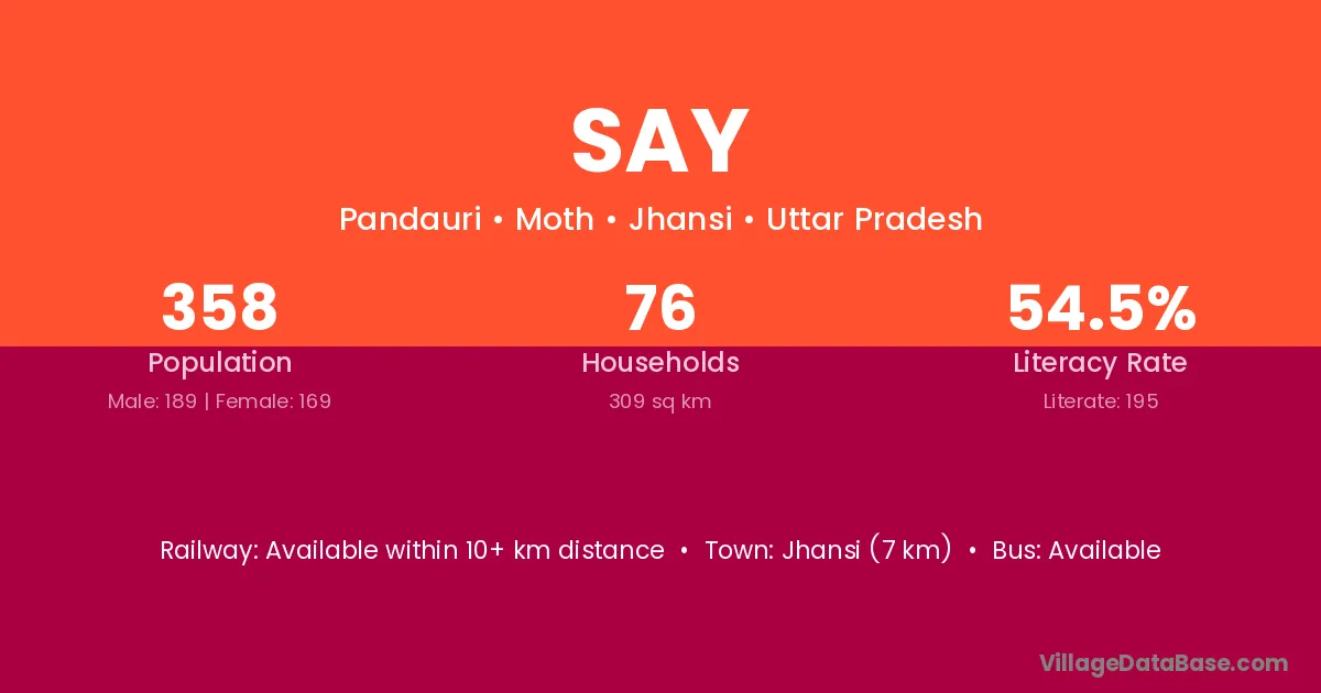 Jhansi (7 km) is the nearest town to Say village for major economic activities and is located approximately 7 km away.