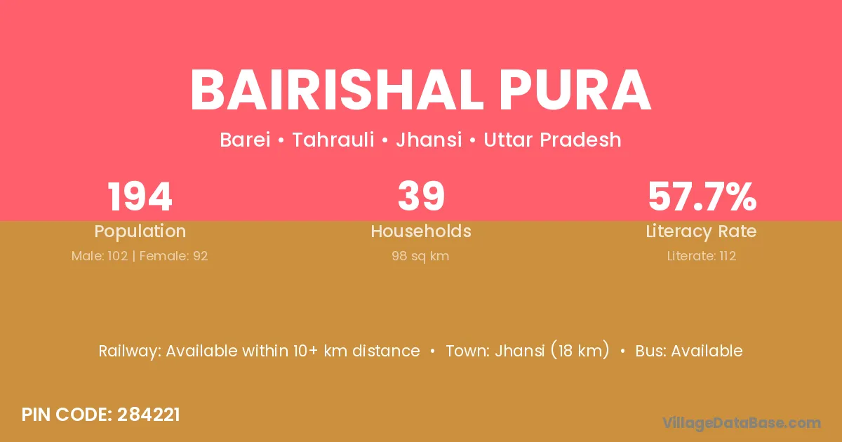 Jhansi (18 km) is the nearest town to Bairishal Pura village for major economic activities and is located approximately 18 km away.