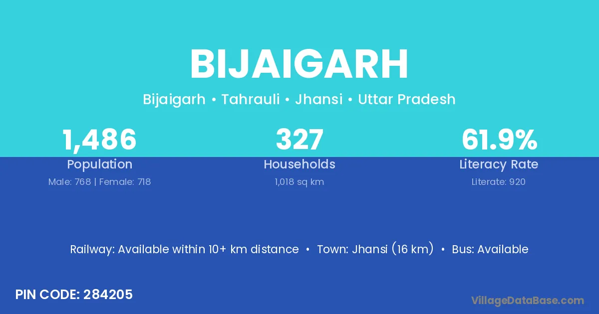 Jhansi (16 km) is the nearest town to Bijaigarh village for major economic activities and is located approximately 16 km away.