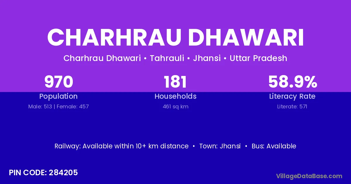 Jhansi is the nearest town to Charhrau Dhawari village for major economic activities