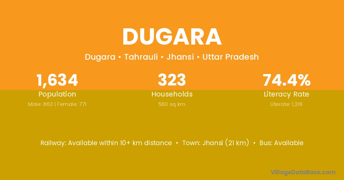 Jhansi (21 km) is the nearest town to Dugara village for major economic activities and is located approximately 21 km away.