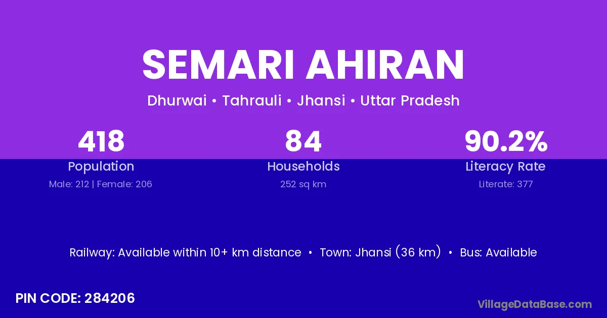 Jhansi (36 km) is the nearest town to Semari Ahiran village for major economic activities and is located approximately 36 km away.
