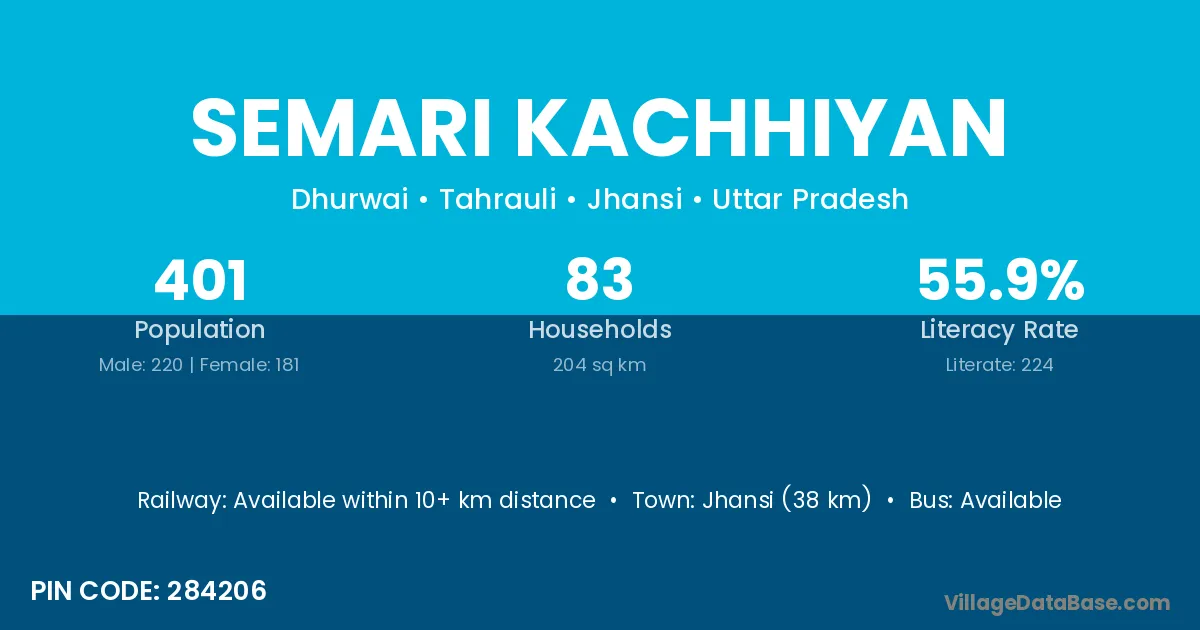 Jhansi (38 km) is the nearest town to Semari Kachhiyan village for major economic activities and is located approximately 38 km away.