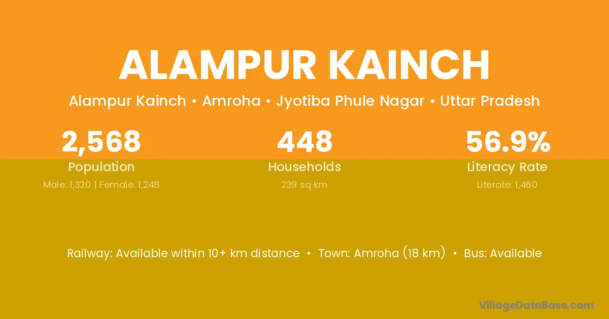 Amroha (18 km) is the nearest town to Alampur Kainch village for major economic activities and is located approximately 18 km away.