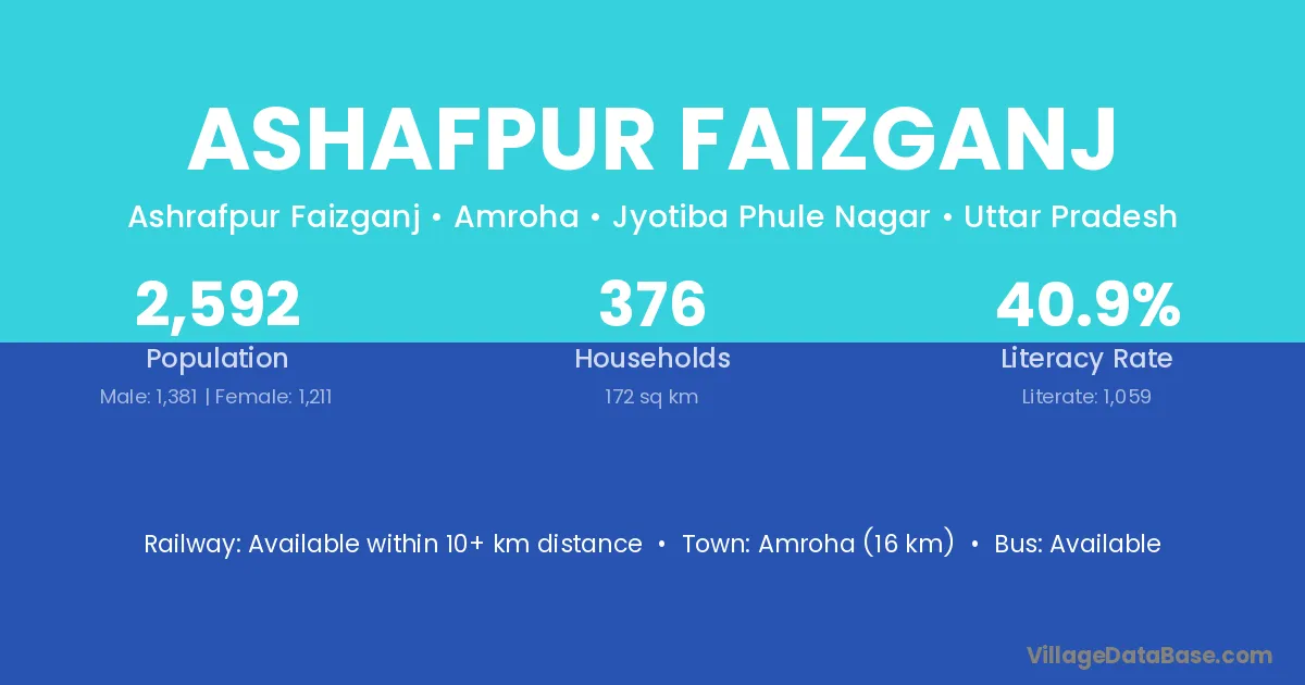Amroha (16 km) is the nearest town to Ashafpur Faizganj village for major economic activities and is located approximately 16 km away.