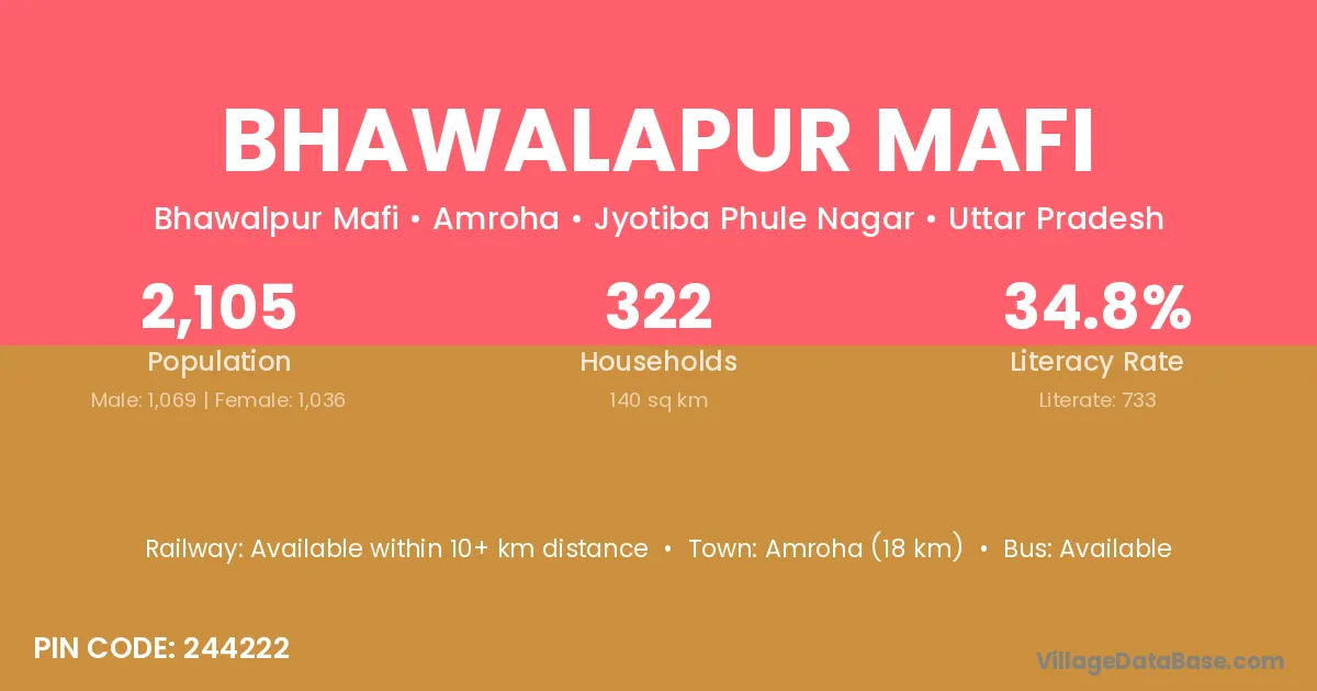 Amroha (18 km) is the nearest town to Bhawalapur Mafi village for major economic activities and is located approximately 18 km away.