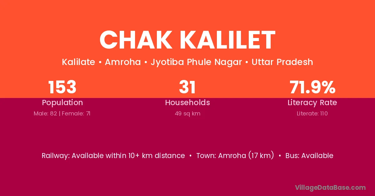 Amroha (17 km) is the nearest town to Chak Kalilet village for major economic activities and is located approximately 17 km away.
