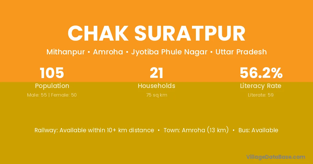 Amroha (13 km) is the nearest town to Chak Suratpur village for major economic activities and is located approximately 13 km away.