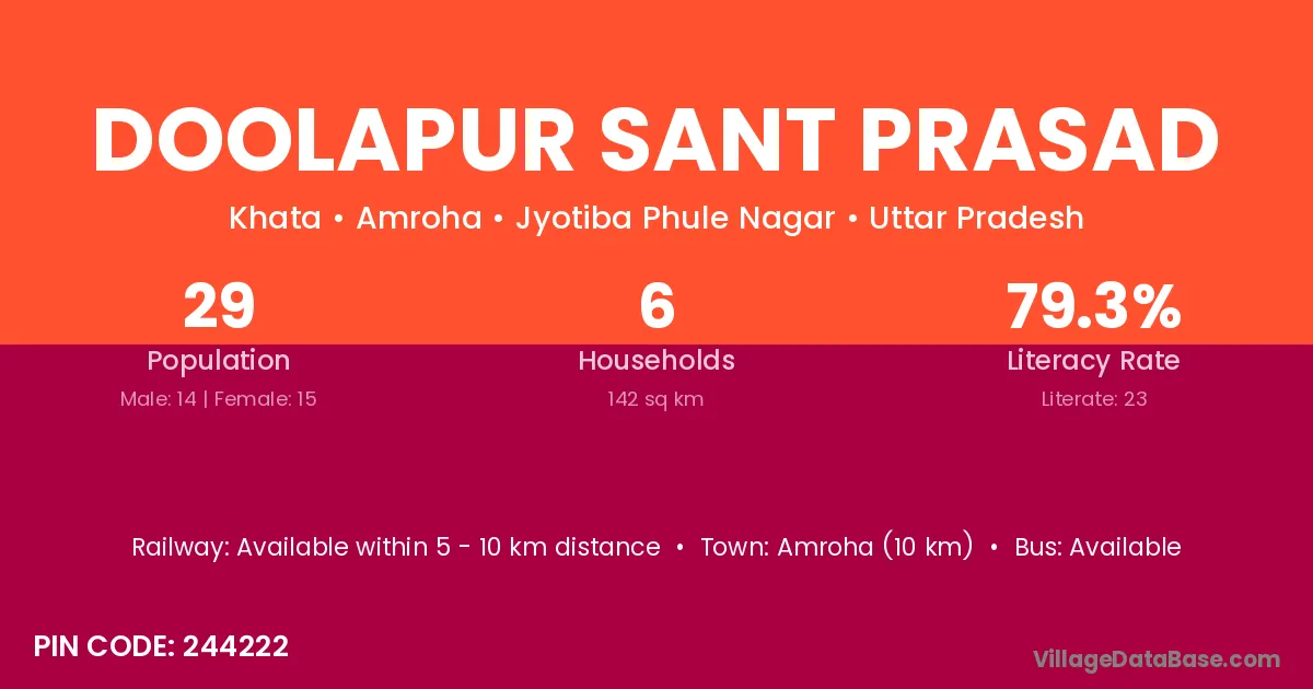 Amroha (10 km) is the nearest town to Doolapur Sant Prasad village for major economic activities and is located approximately 10 km away.