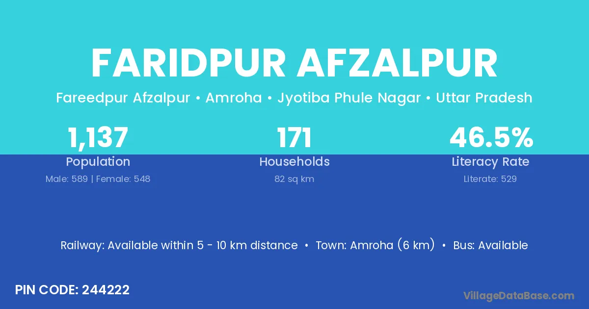 Amroha (6 km) is the nearest town to Faridpur Afzalpur village for major economic activities and is located approximately 6 km away.