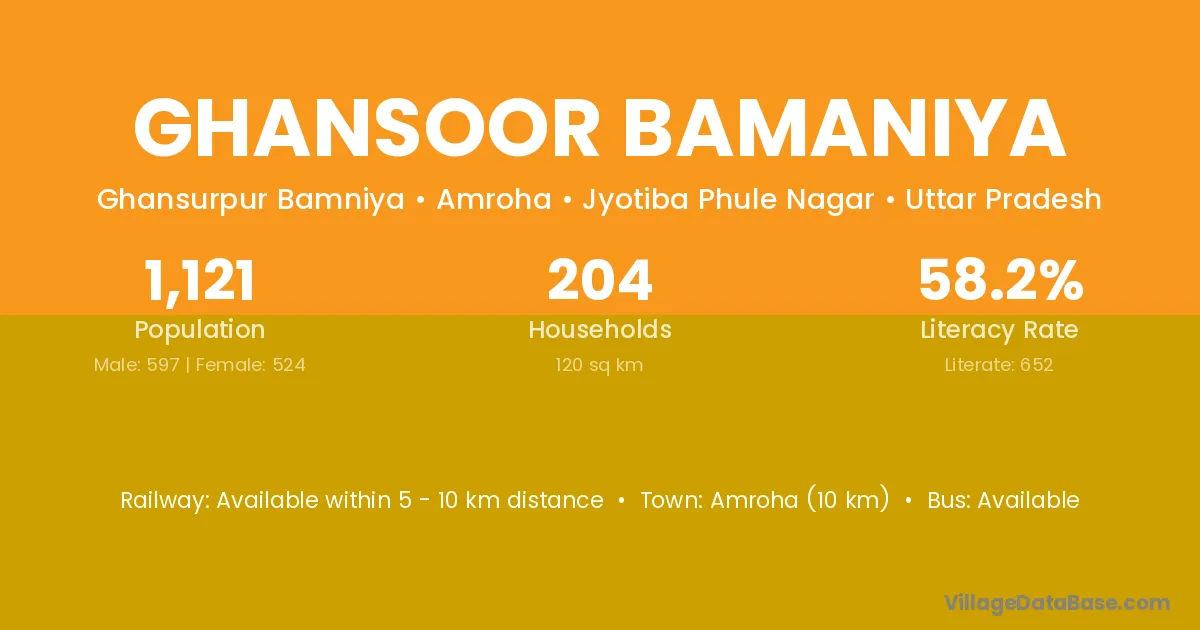 Amroha (10 km) is the nearest town to Ghansoor Bamaniya village for major economic activities and is located approximately 10 km away.