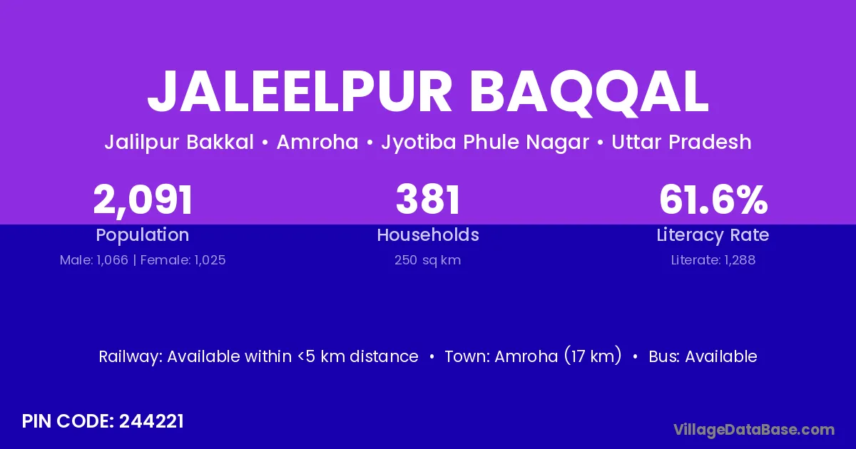 Amroha (17 km) is the nearest town to Jaleelpur Baqqal village for major economic activities and is located approximately 17 km away.