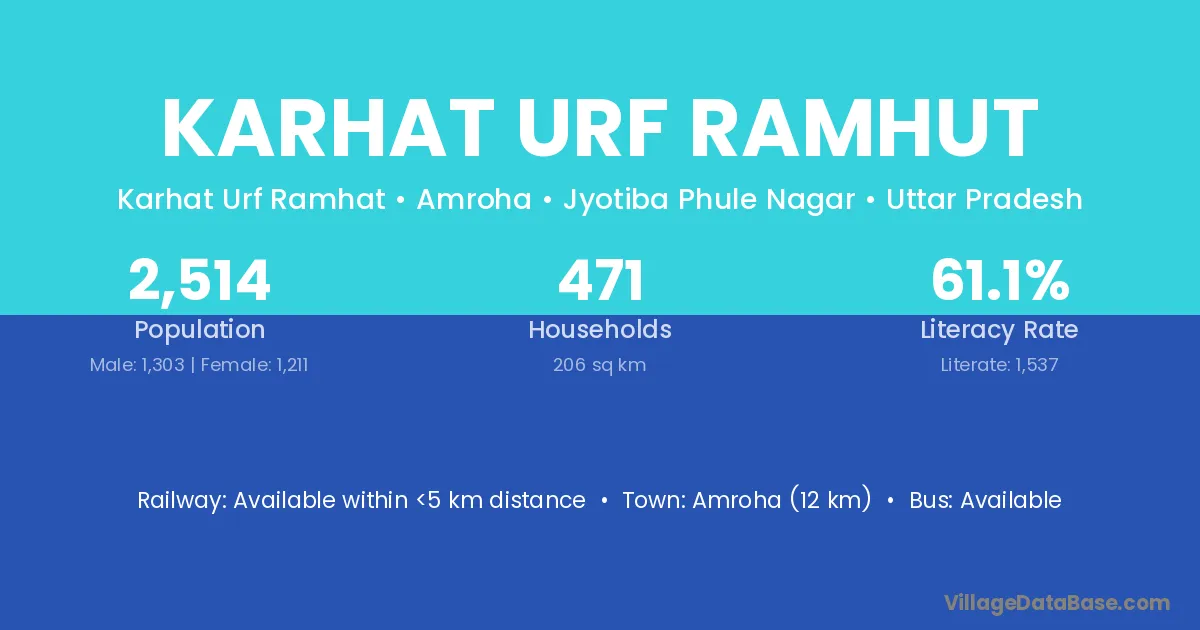 Amroha (12 km) is the nearest town to Karhat Urf Ramhut village for major economic activities and is located approximately 12 km away.
