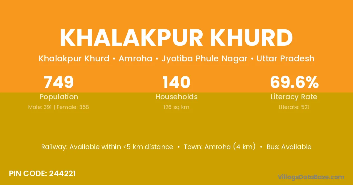 Amroha (4 km) is the nearest town to Khalakpur Khurd village for major economic activities and is located approximately 4 km away.