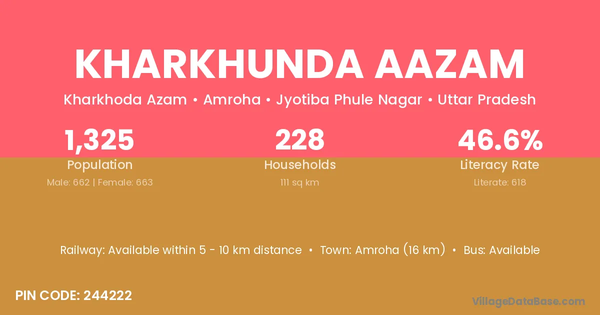 Amroha (16 km) is the nearest town to Kharkhunda Aazam village for major economic activities and is located approximately 16 km away.
