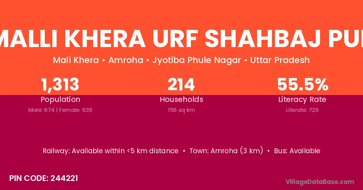 Amroha (3 km) is the nearest town to Malli Khera Urf Shahbaj Pur village for major economic activities and is located approximately 3 km away.