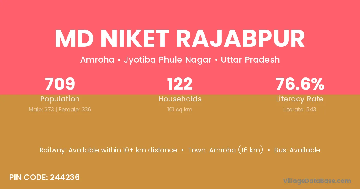 Amroha (16 km) is the nearest town to Md Niket Rajabpur village for major economic activities and is located approximately 16 km away.