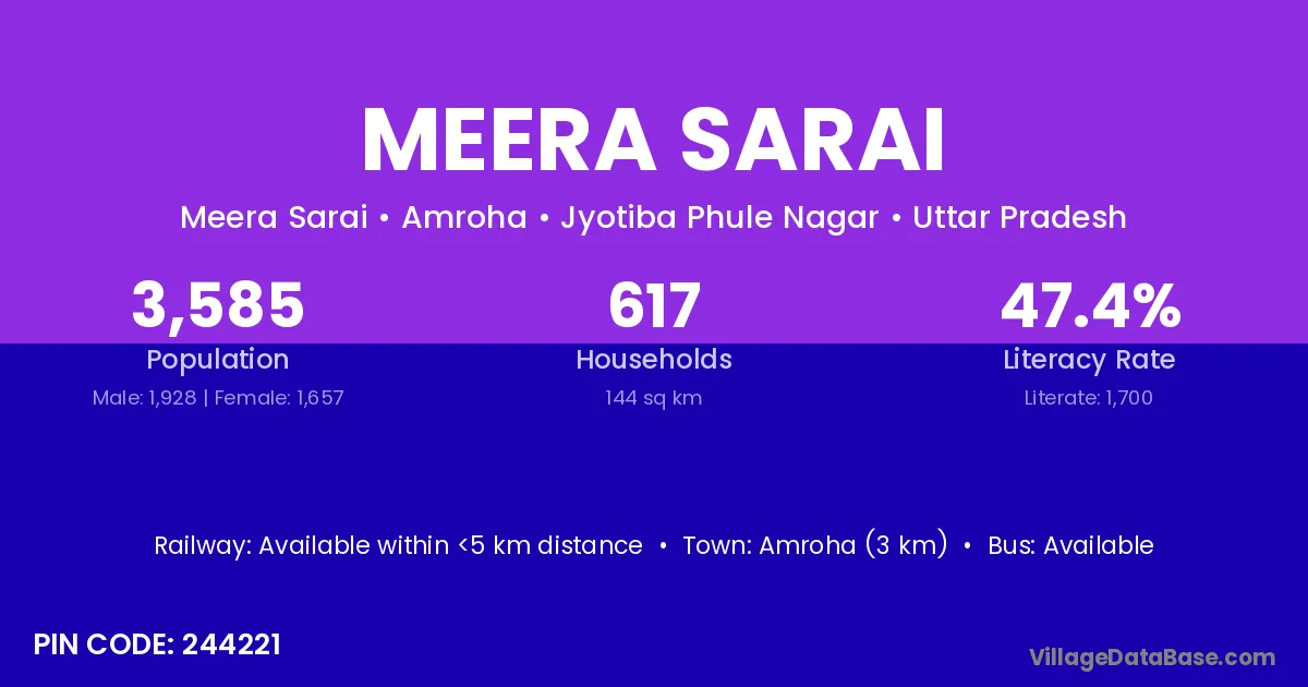 Amroha (3 km) is the nearest town to Meera Sarai village for major economic activities and is located approximately 3 km away.