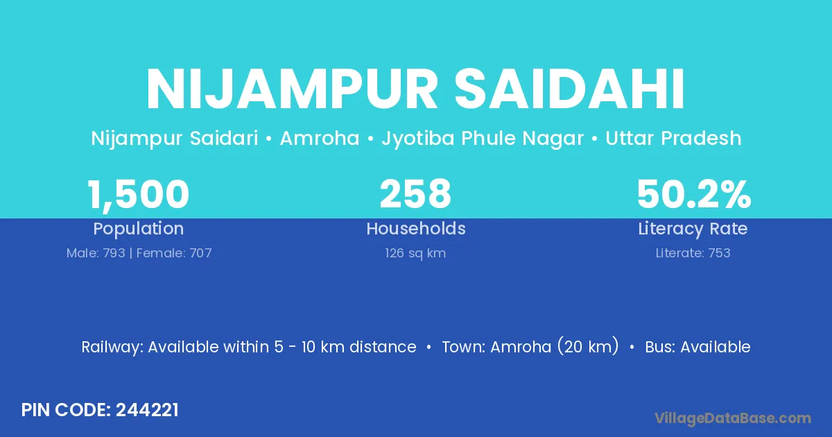 Amroha (20 km) is the nearest town to Nijampur Saidahi village for major economic activities and is located approximately 20 km away.