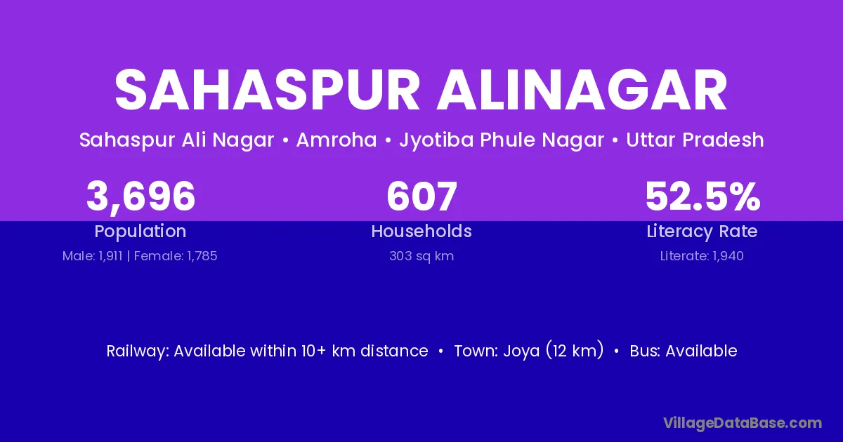 Sahaspur Alinagar village has a total population of 3,696 people, of which 1,911 are males and 1,785 are females.