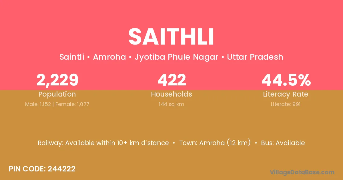 Amroha (12 km) is the nearest town to Saithli village for major economic activities and is located approximately 12 km away.