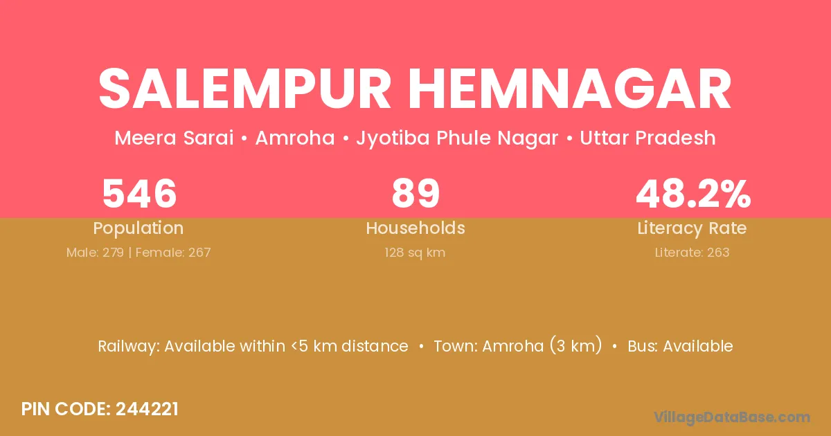 Amroha (3 km) is the nearest town to Salempur Hemnagar village for major economic activities and is located approximately 3 km away.