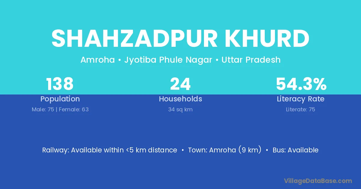 Amroha (9 km) is the nearest town to Shahzadpur Khurd village for major economic activities and is located approximately 9 km away.