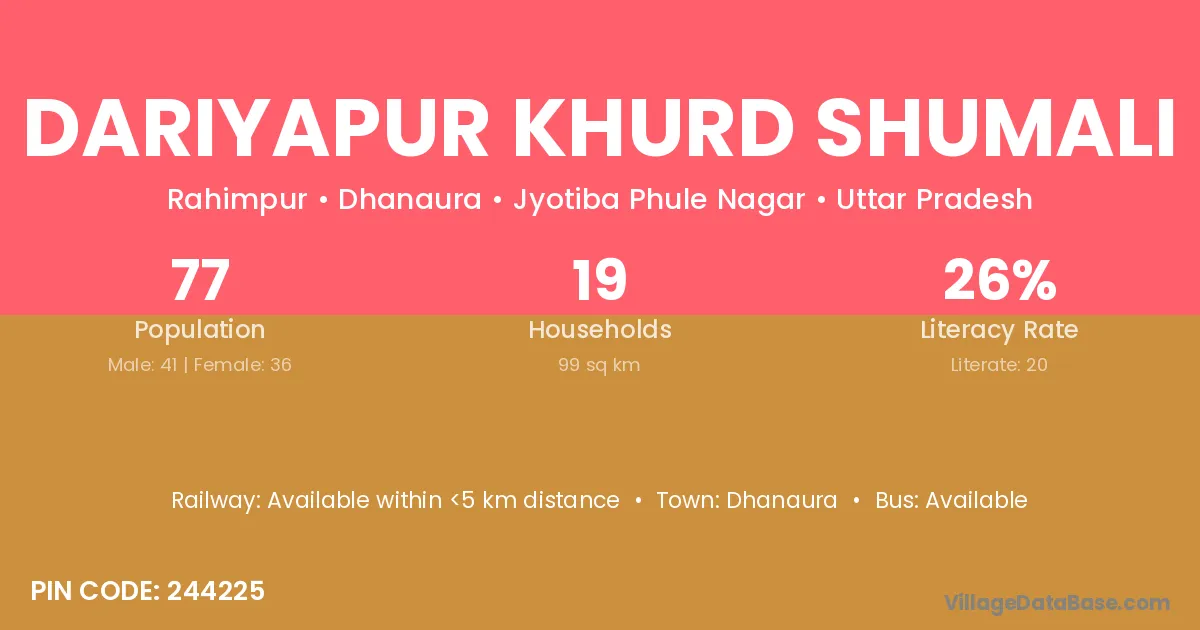 Dariyapur Khurd Shumali village has a total population of 77 people, of which 41 are males and 36 are females.