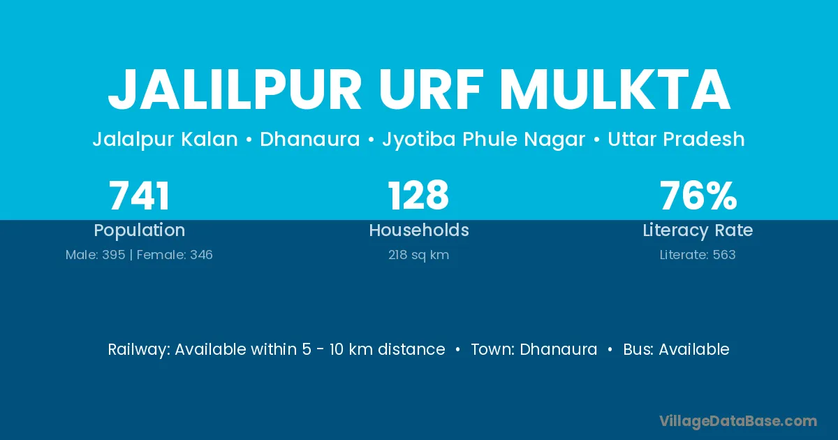 Jalilpur Urf Mulkta village has a total population of 741 people, of which 395 are males and 346 are females.