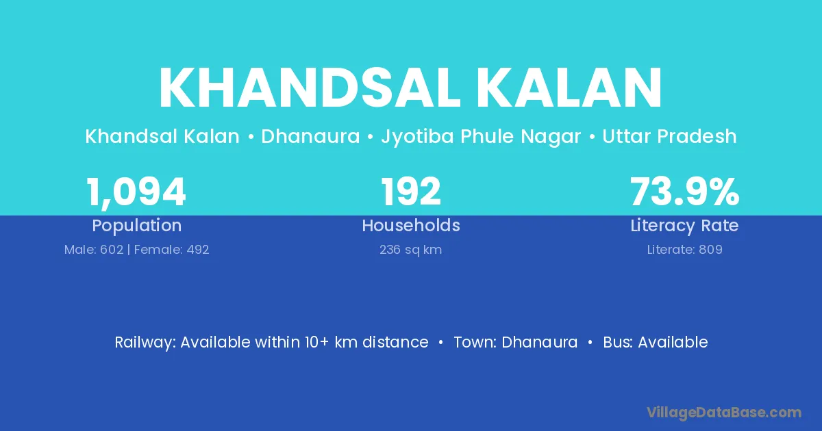 Khandsal Kalan village has a total population of 1,094 people, of which 602 are males and 492 are females.