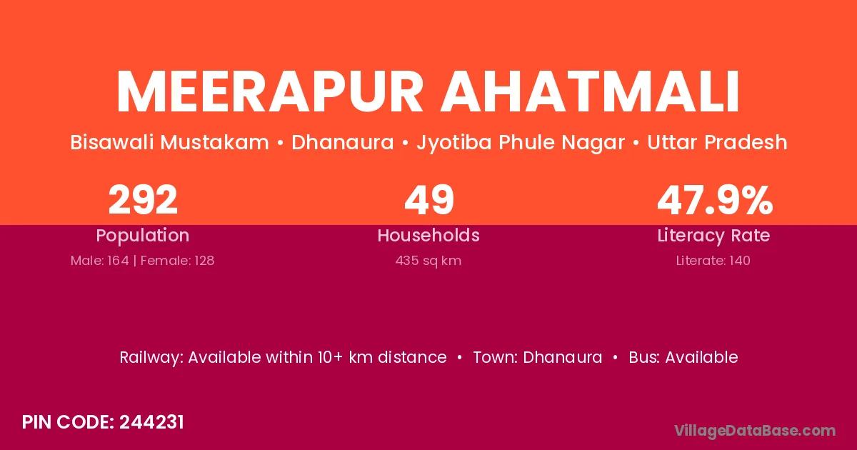 Meerapur Ahatmali village has a total population of 292 people, of which 164 are males and 128 are females.