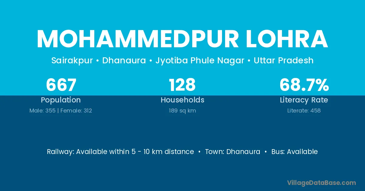 Mohammedpur Lohra village has a total population of 667 people, of which 355 are males and 312 are females.