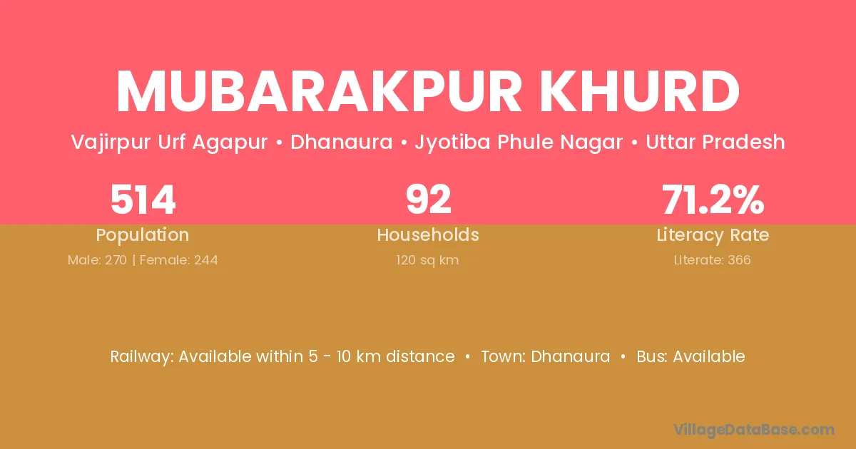 Mubarakpur Khurd village has a total population of 514 people, of which 270 are males and 244 are females.