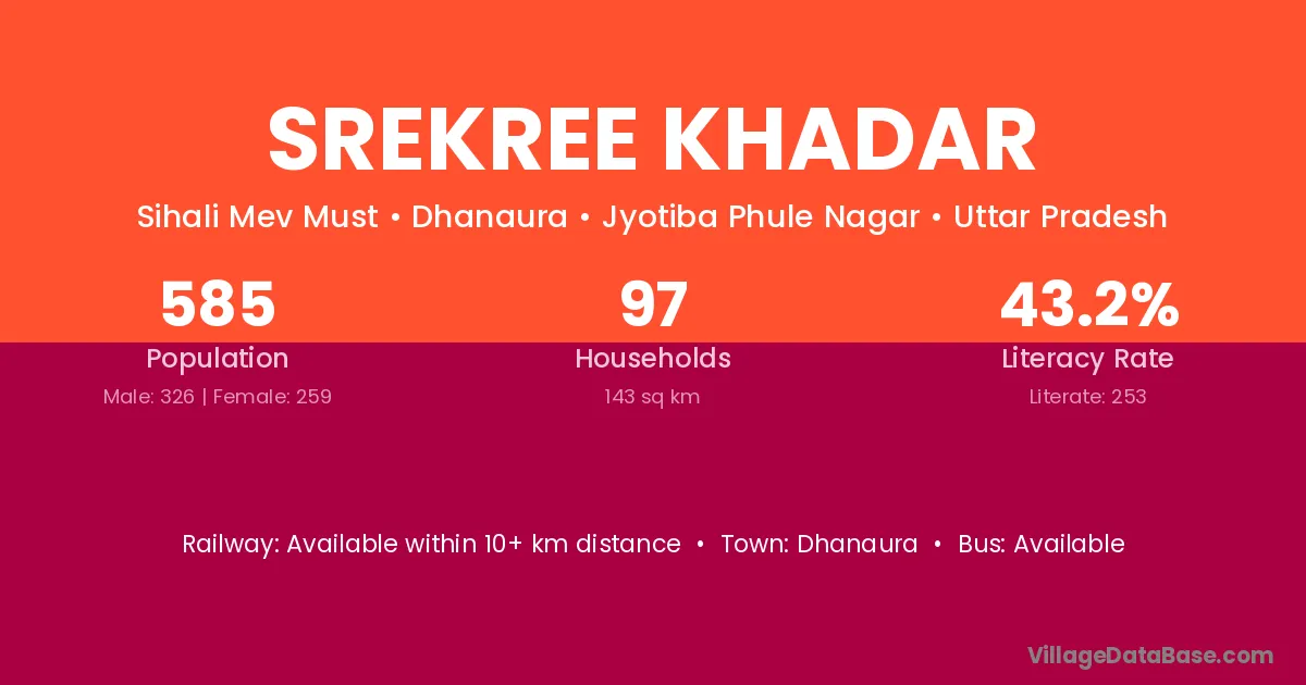 Srekree Khadar village has a total population of 585 people, of which 326 are males and 259 are females.