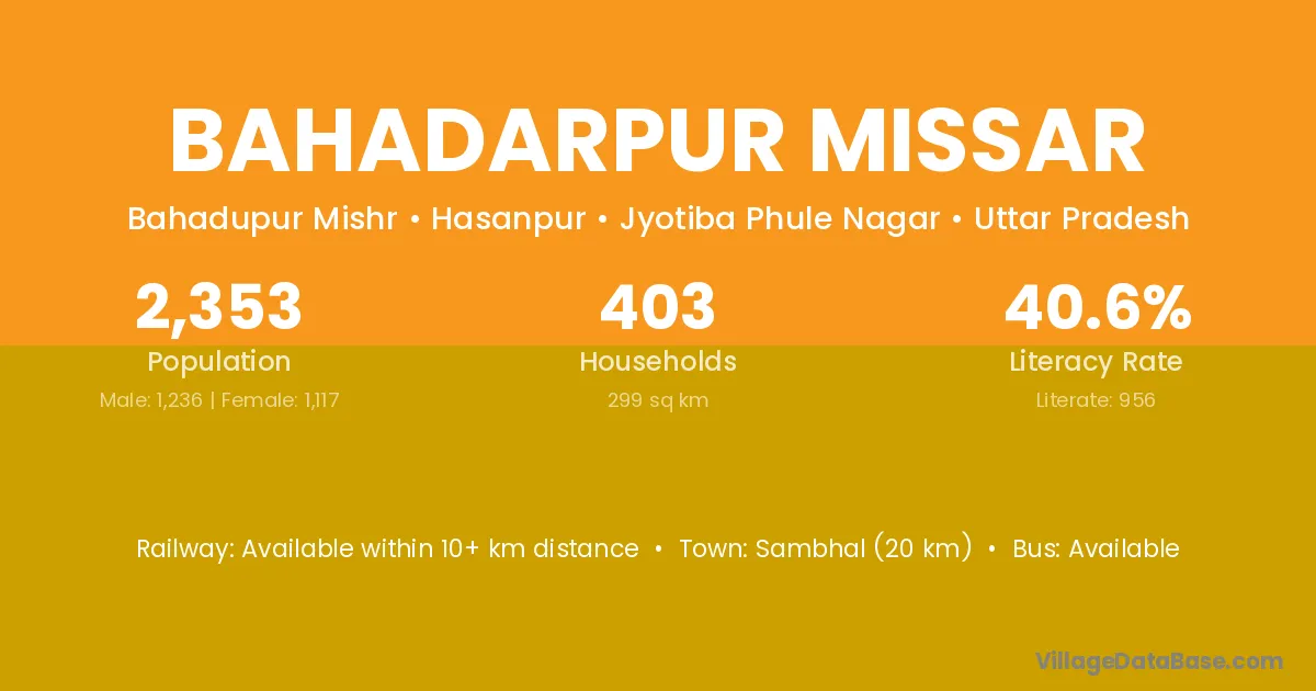 Sambhal (20 km) is the nearest town to Bahadarpur Missar village for major economic activities and is located approximately 20 km away.