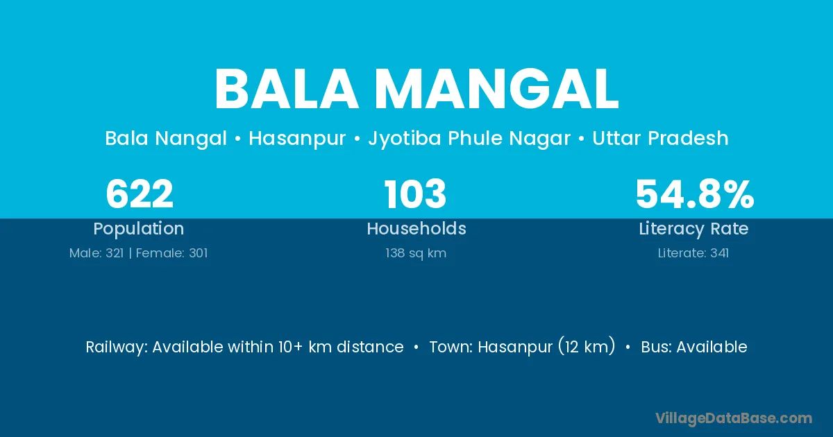 Hasanpur (12 km) is the nearest town to Bala Mangal village for major economic activities and is located approximately 12 km away.