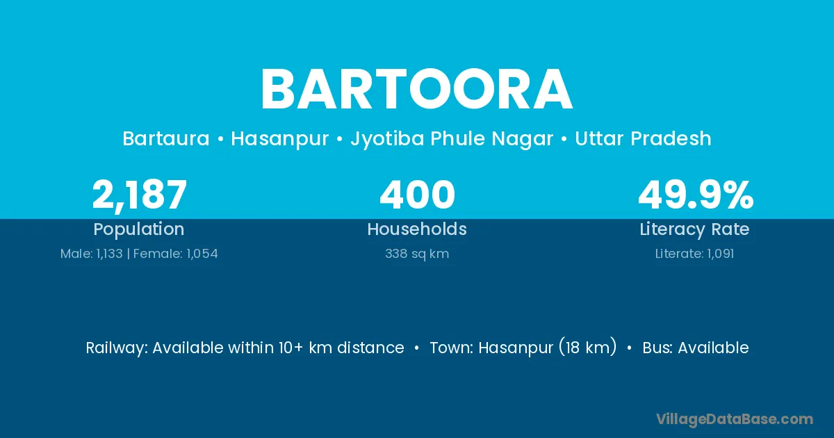 Hasanpur (18 km) is the nearest town to Bartoora village for major economic activities and is located approximately 18 km away.