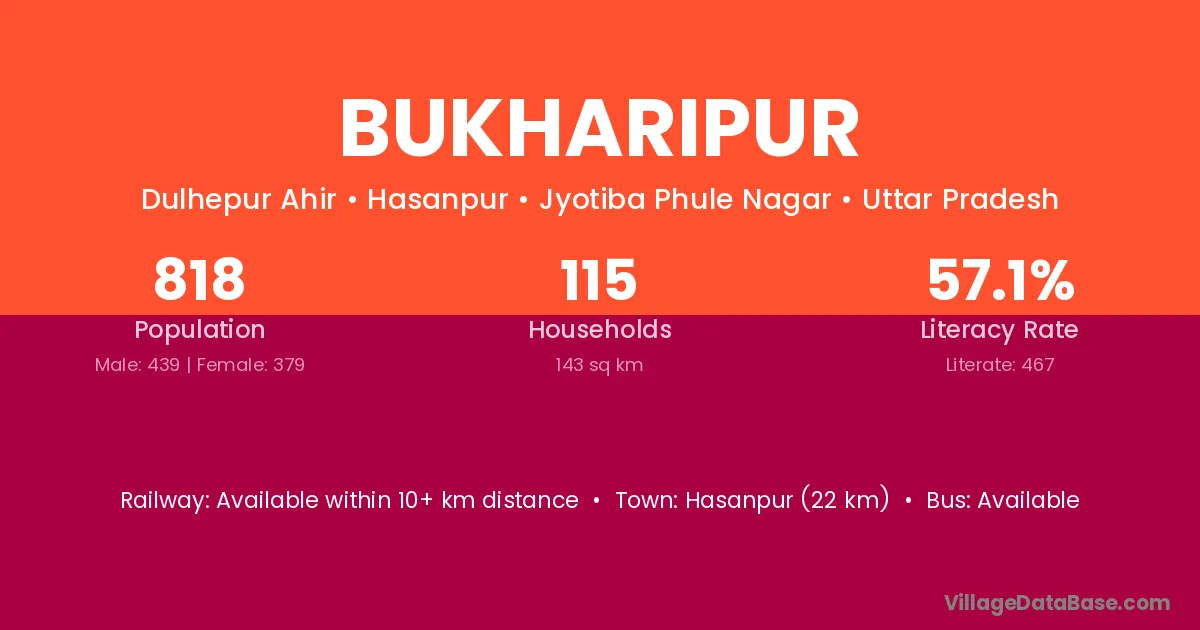 Hasanpur (22 km) is the nearest town to Bukharipur village for major economic activities and is located approximately 22 km away.