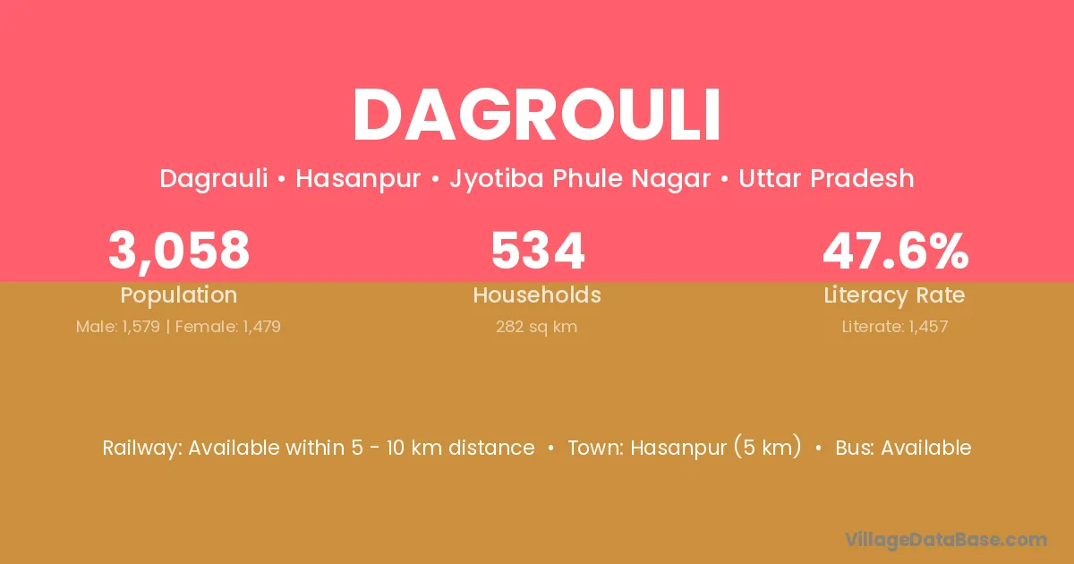 Hasanpur (5 km) is the nearest town to Dagrouli village for major economic activities and is located approximately 5 km away.