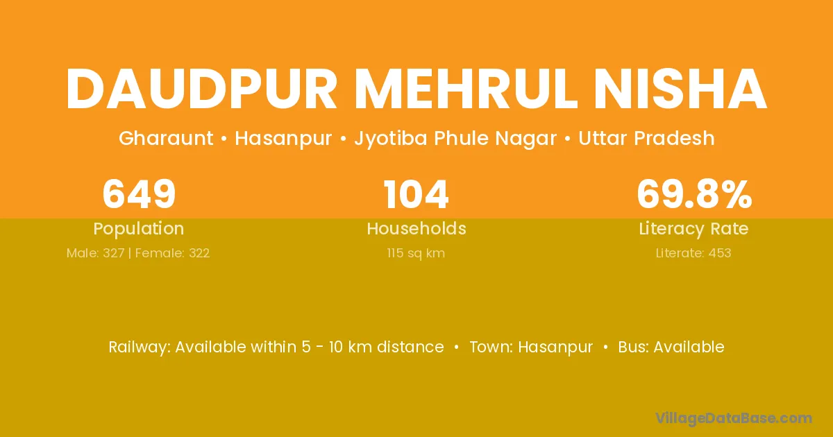 Daudpur Mehrul Nisha village has a total population of 649 people, of which 327 are males and 322 are females.