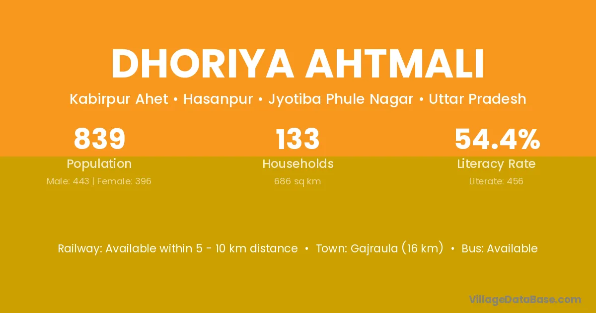 Dhoriya Ahtmali village has a total population of 839 people, of which 443 are males and 396 are females.