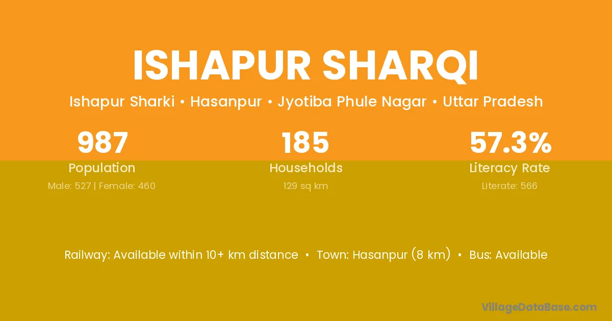 Hasanpur (8 km) is the nearest town to Ishapur Sharqi village for major economic activities and is located approximately 8 km away.