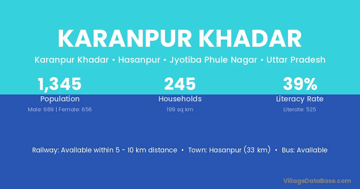 Hasanpur (33 km) is the nearest town to Karanpur Khadar village for major economic activities and is located approximately 33 km away.