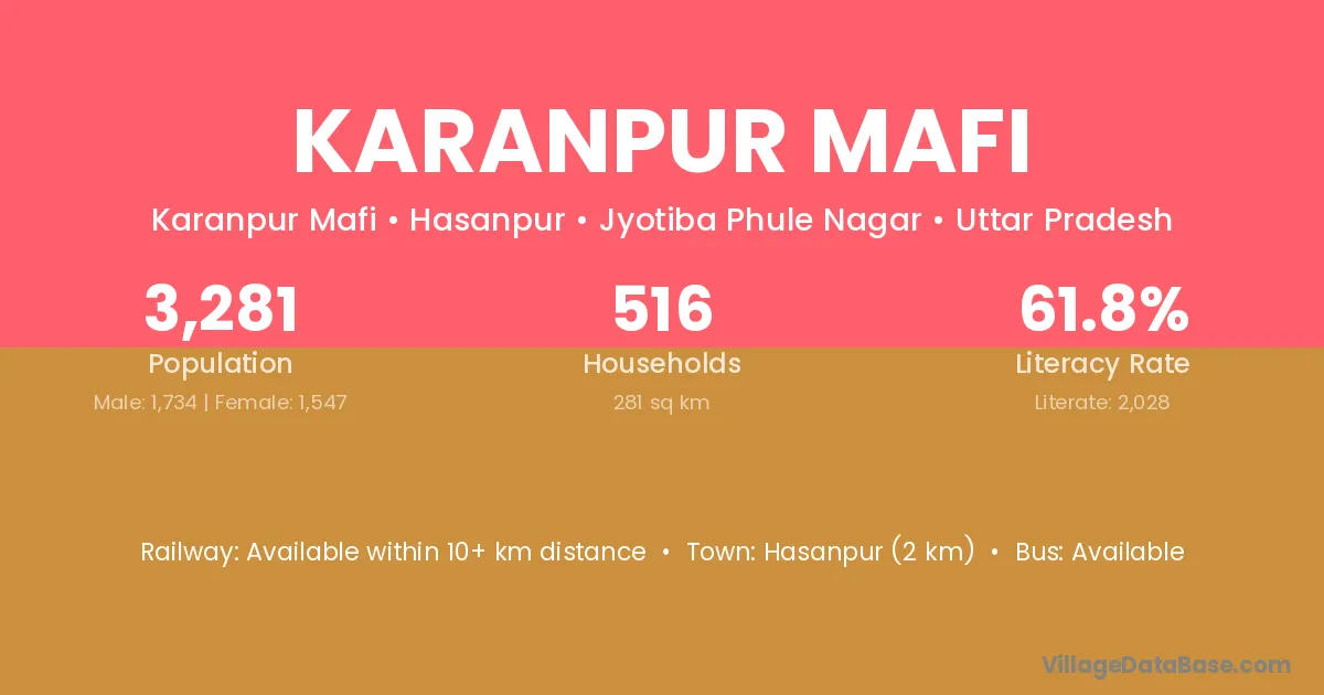 Hasanpur (2 km) is the nearest town to Karanpur Mafi village for major economic activities and is located approximately 2 km away.
