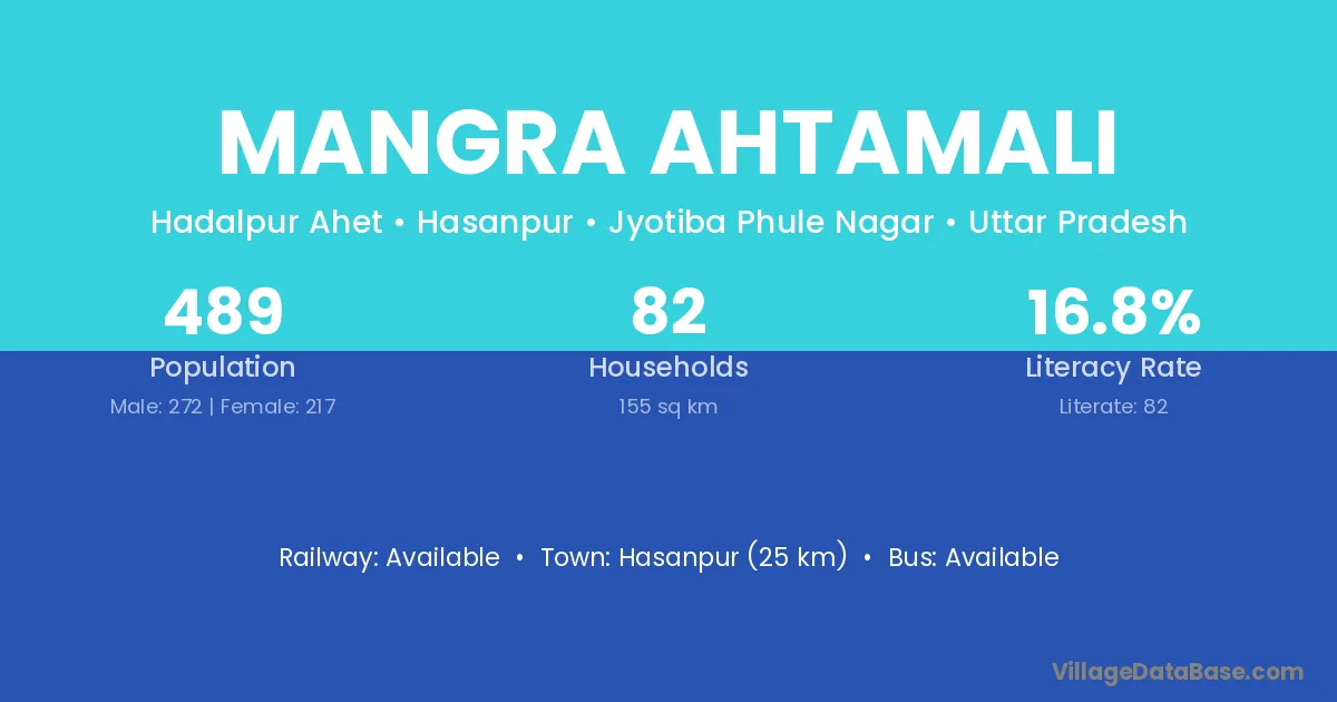 Hasanpur (25 km) is the nearest town to Mangra Ahtamali village for major economic activities and is located approximately 25 km away.